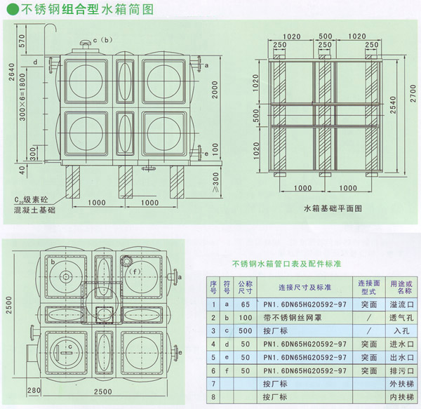 1、產(chǎn)品可根據(jù)用戶需求,從0.5m3~2000m3任意組合。水箱的有效容量按高度-230mm計算。